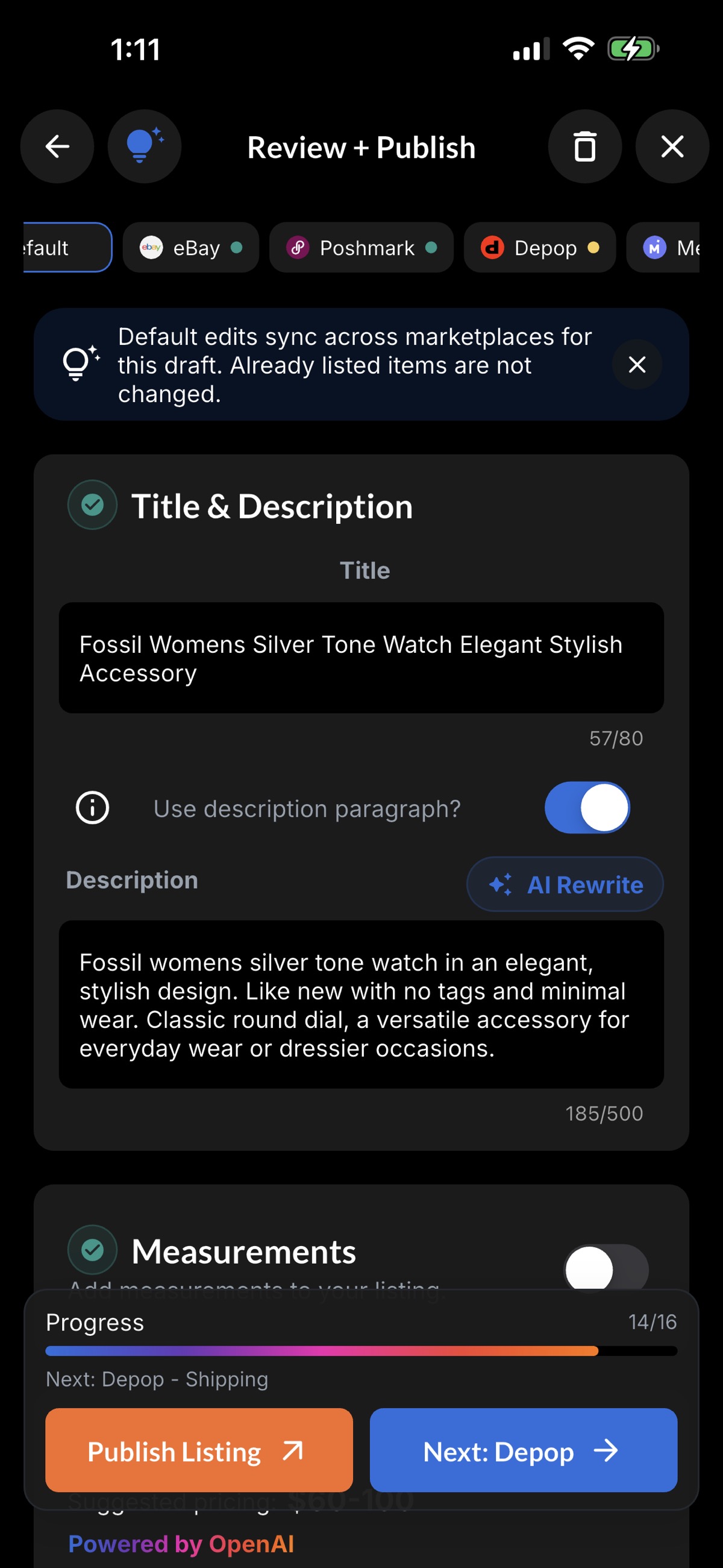 Use the same item flow for titles, descriptions, photos, and specifics before publishing.